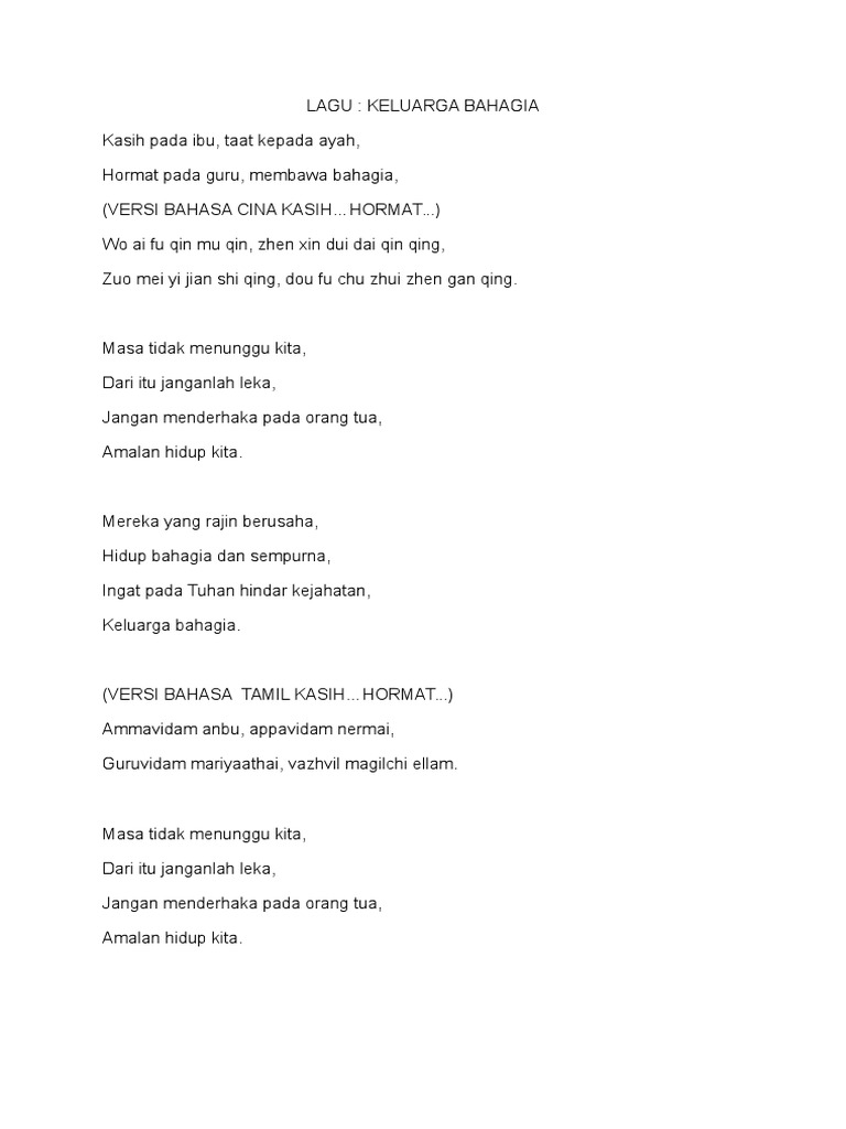 Berikut lirik lagu keluarga bahagia. NOWSEEHEART Bahagia seluruh semesta Bermula dari keluarga Dari titisan susu ibu tercinta Mengalirlah sungai kasih abadi Tumbuh dari keringat ayah Kita perah pengorbanannya yang melimpah Derai air matanya mengalir Di darah kita membina cita-cita Rentaslah seribu laut serta Kembaralah ke seluruh alam Takkan kau temui Semurni. Lirik Lagu Keluarga Bahagia Penyanyi.
